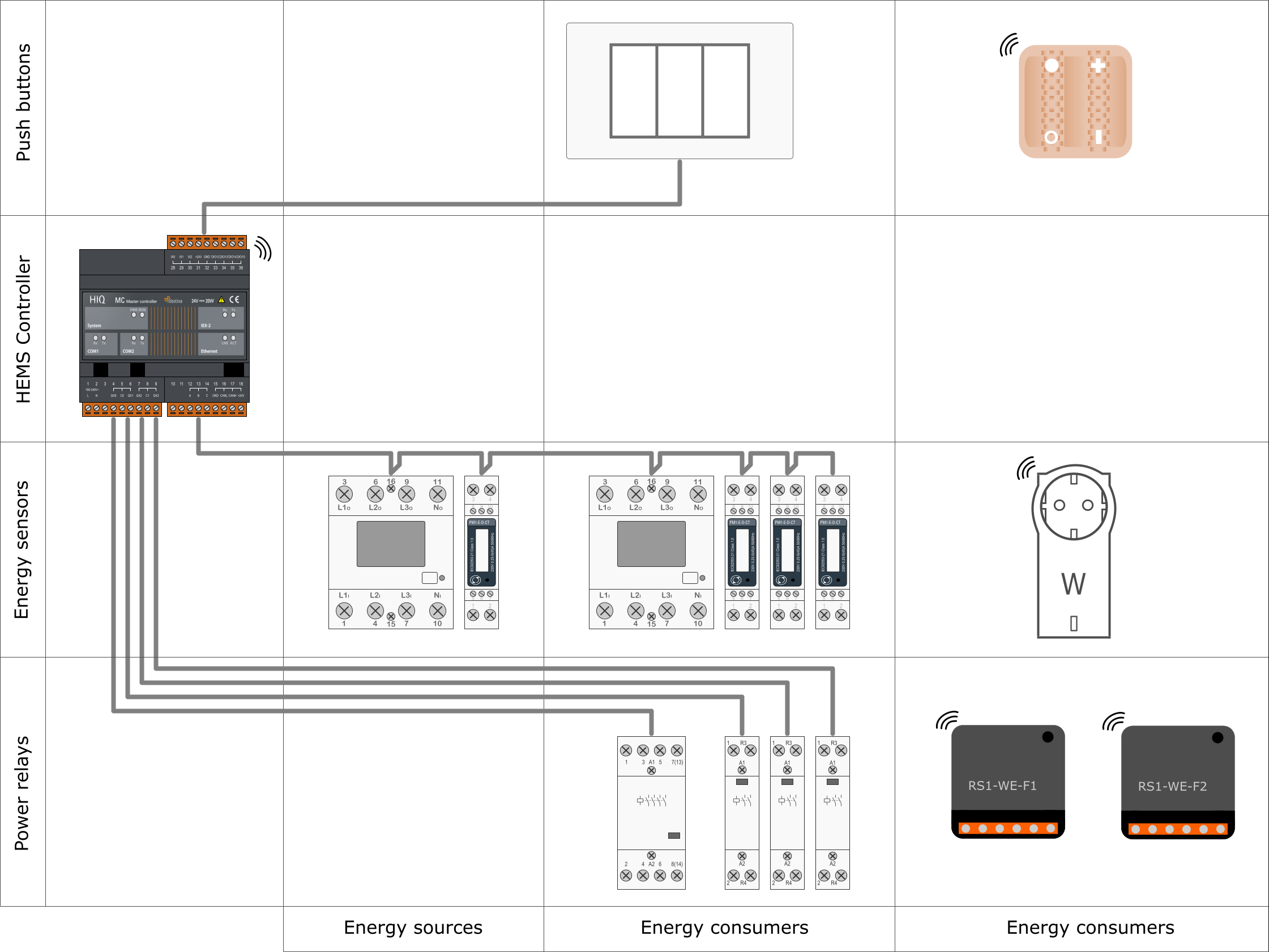 Are used for manual control of managed devices. Push buttons are directly wired or paired (Soft remote) and to HEMS master controller MC-230.